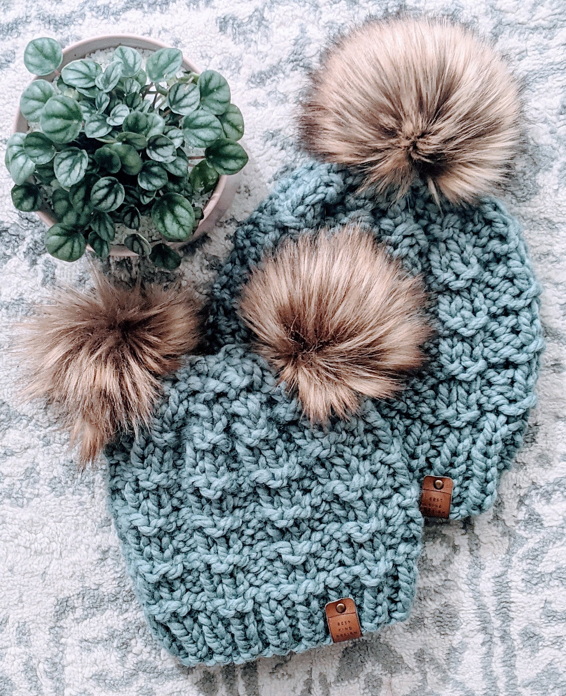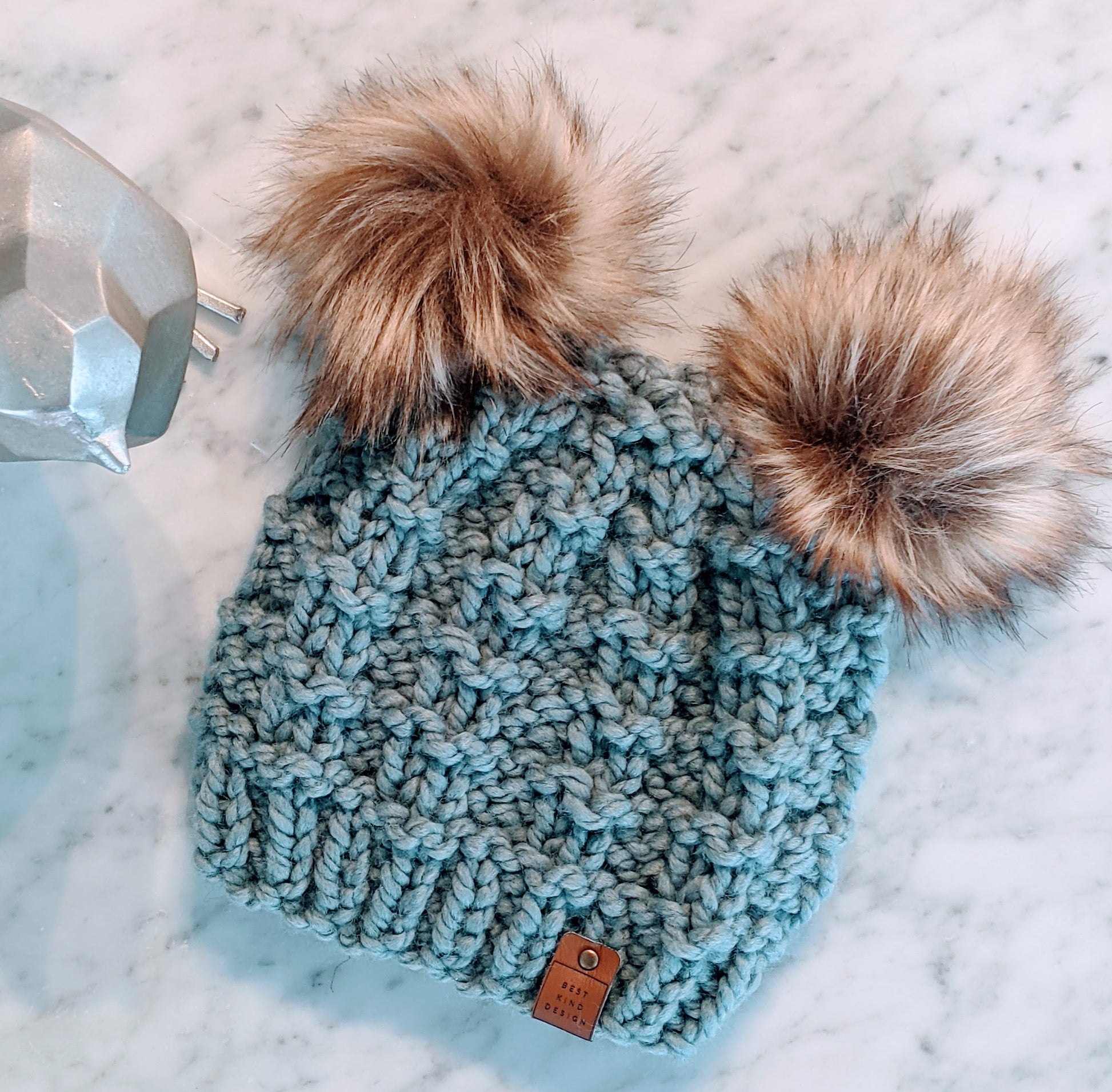 Step out in style this winter with this adorable matching Mommy & Me Winter Hat Set. This beautiful winter beanie set is hand knit and is designed to fit an average size Adult and Toddler (Age 1-3). It is knit in a beautiful soft green-blue gender neutral colour, and is adorned with one 5" luxury faux fur pom pom (Adult size) and two 3" Faux Fur pom poms (Toddler Size).