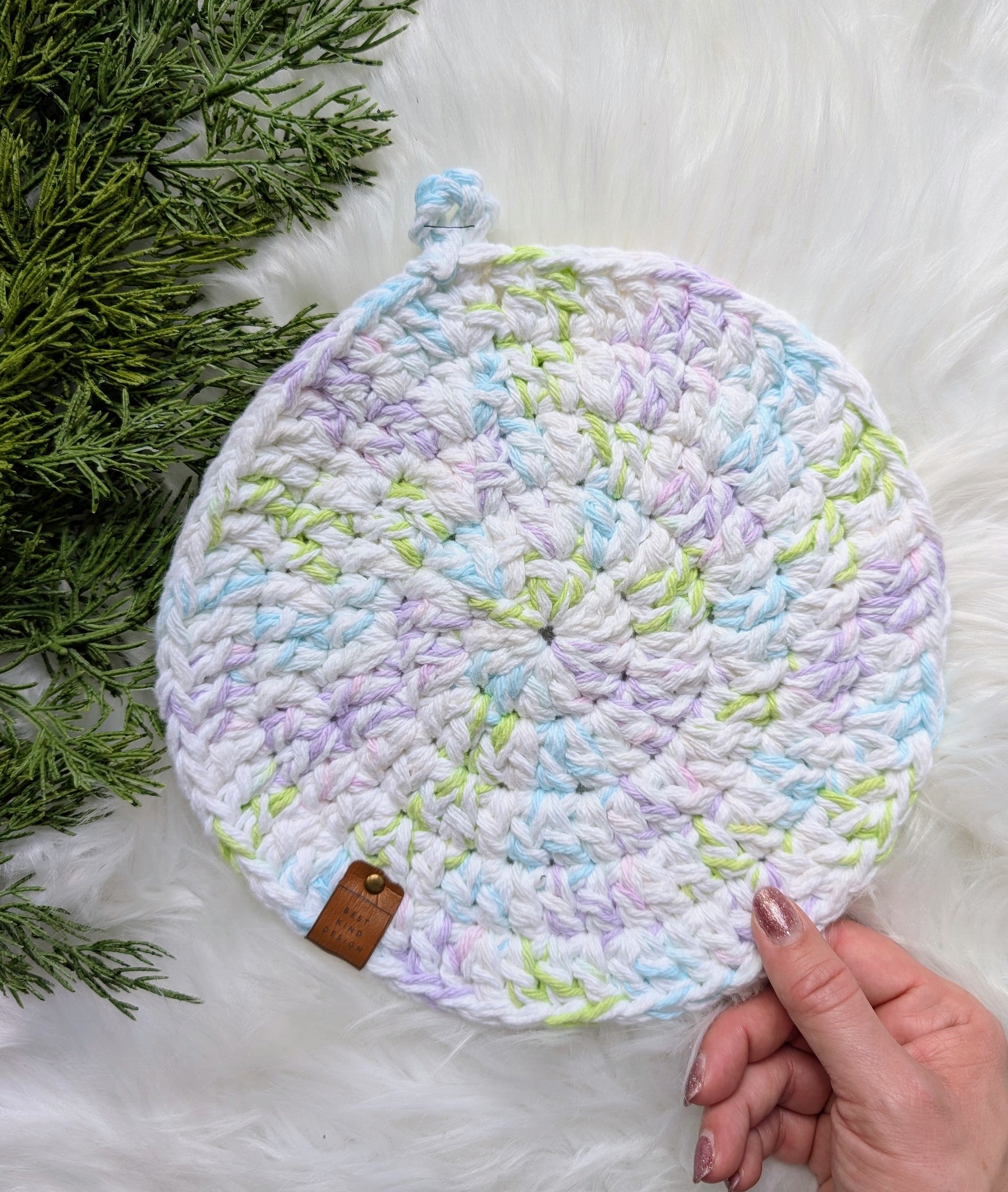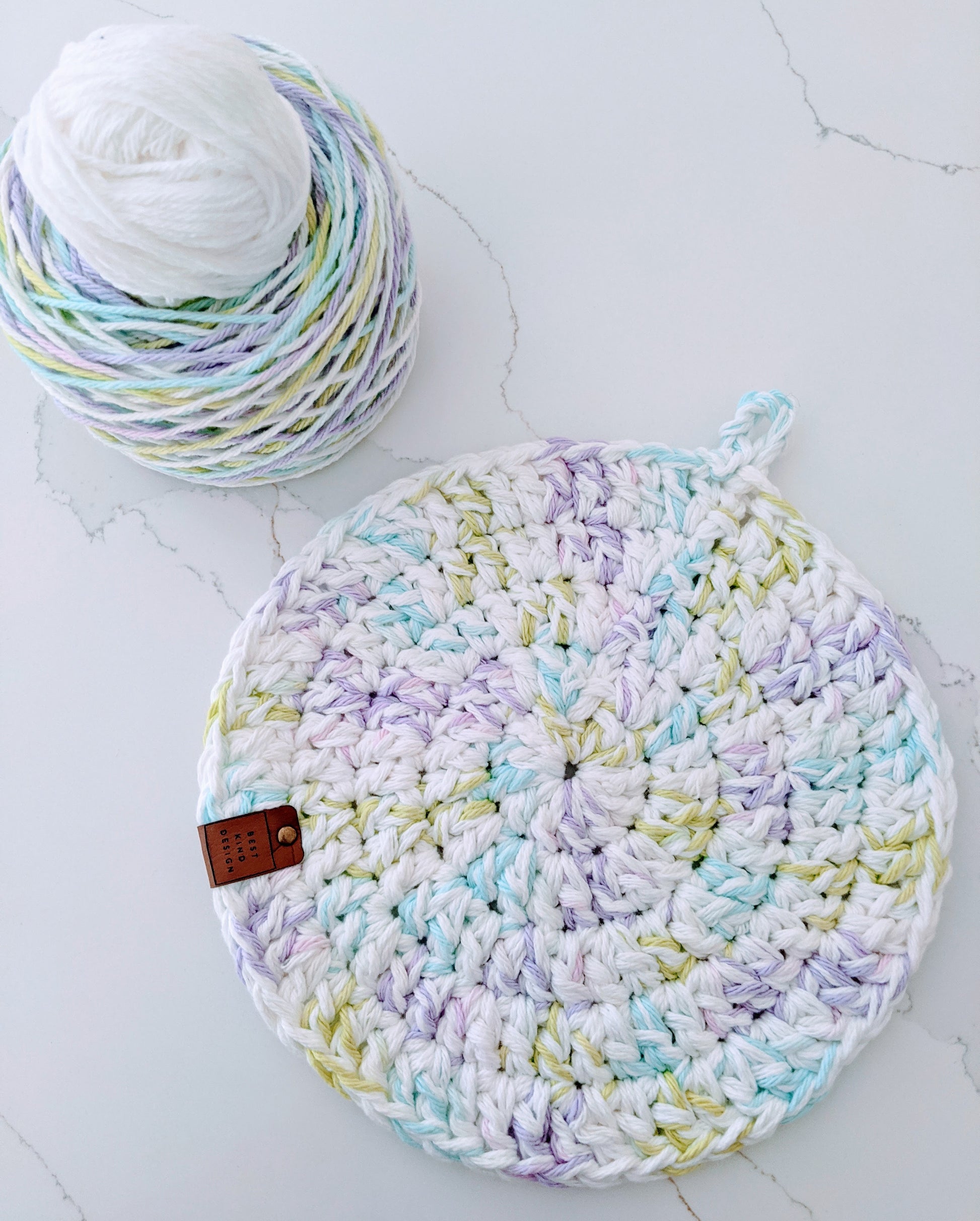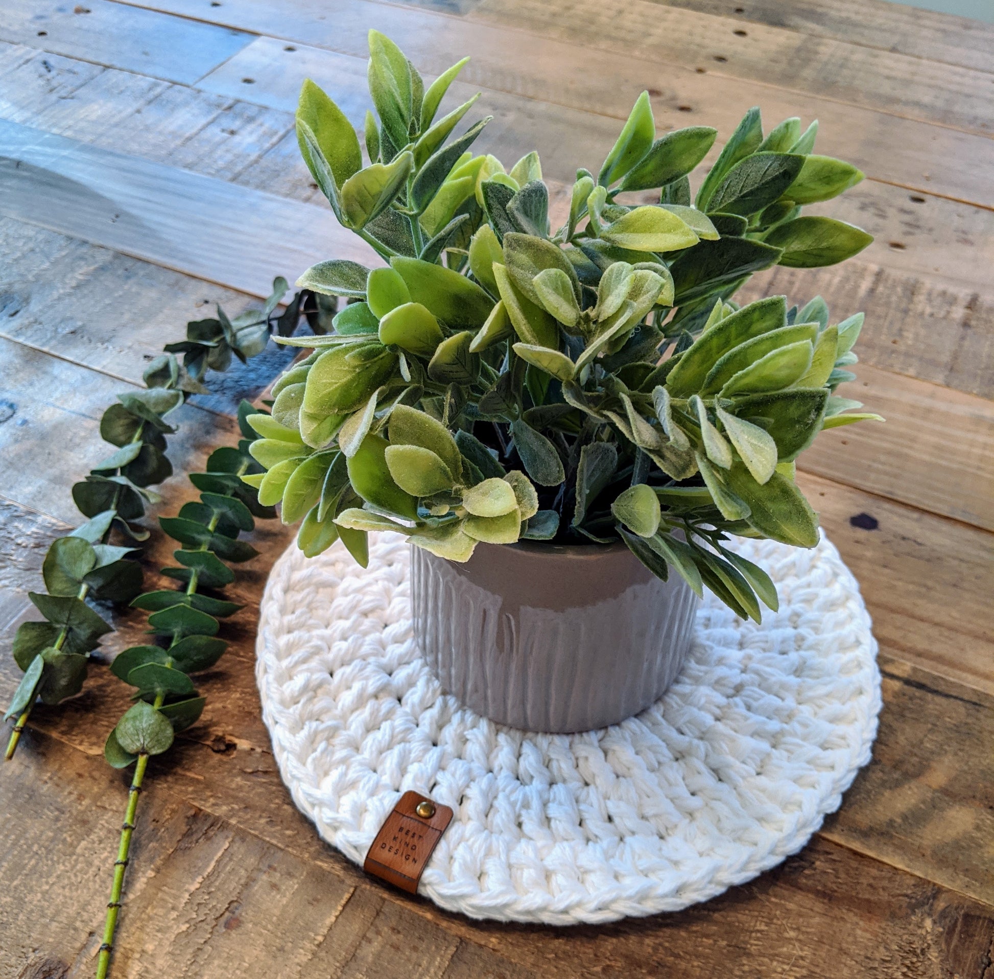 The finished dimensions are approximately 9" x 9". The trivet is made from 100% cotton. Spot clean or hand wash. Remove faux leather tag before immersing in water. Lay flat to dry.