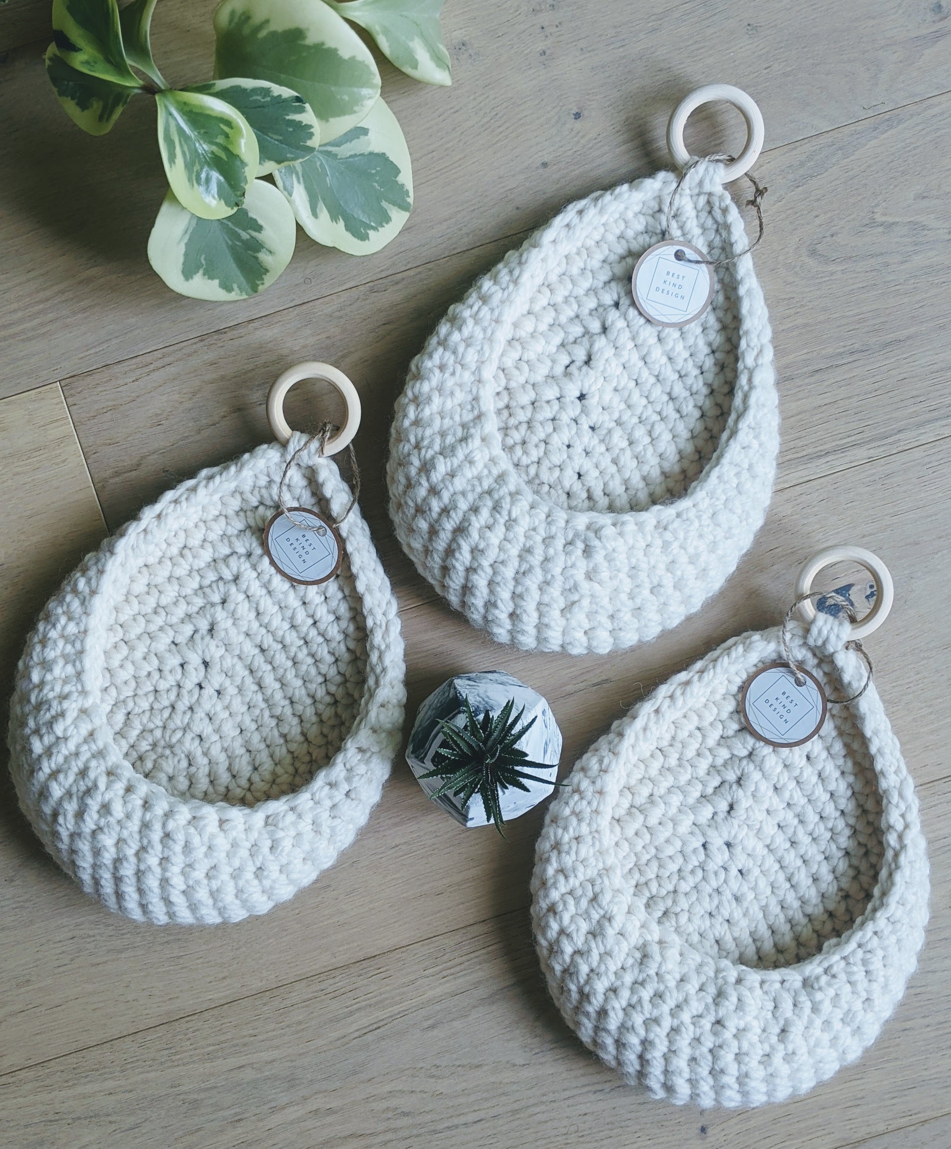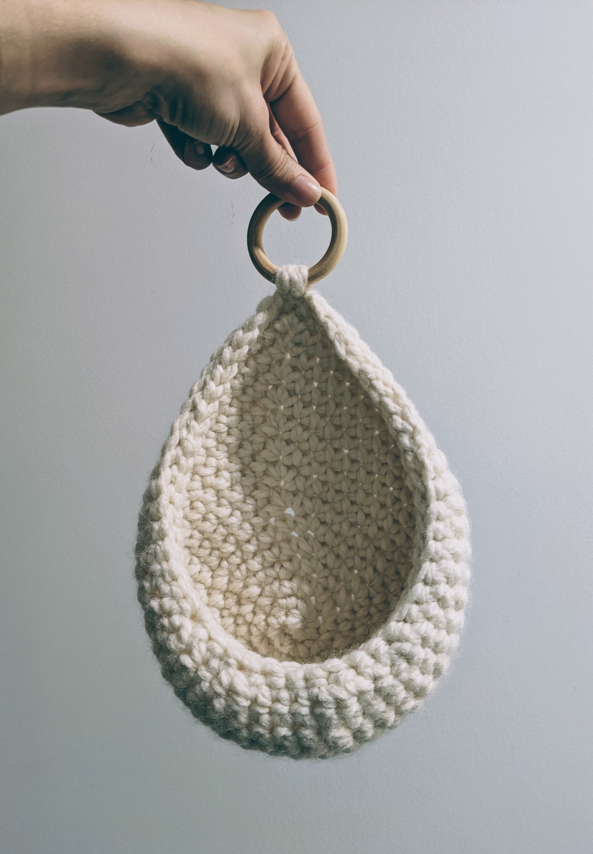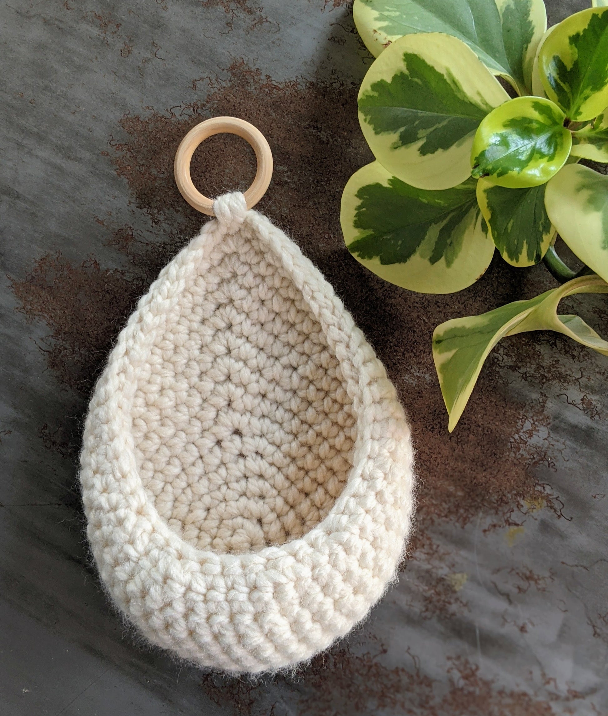 Add a touch of farmhouse modernity to your home with this hand crocheted hanging basket with wooden accent ring.