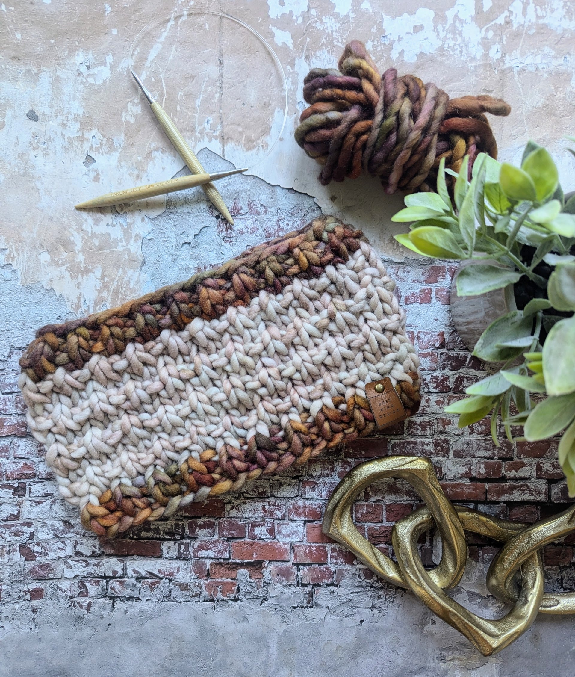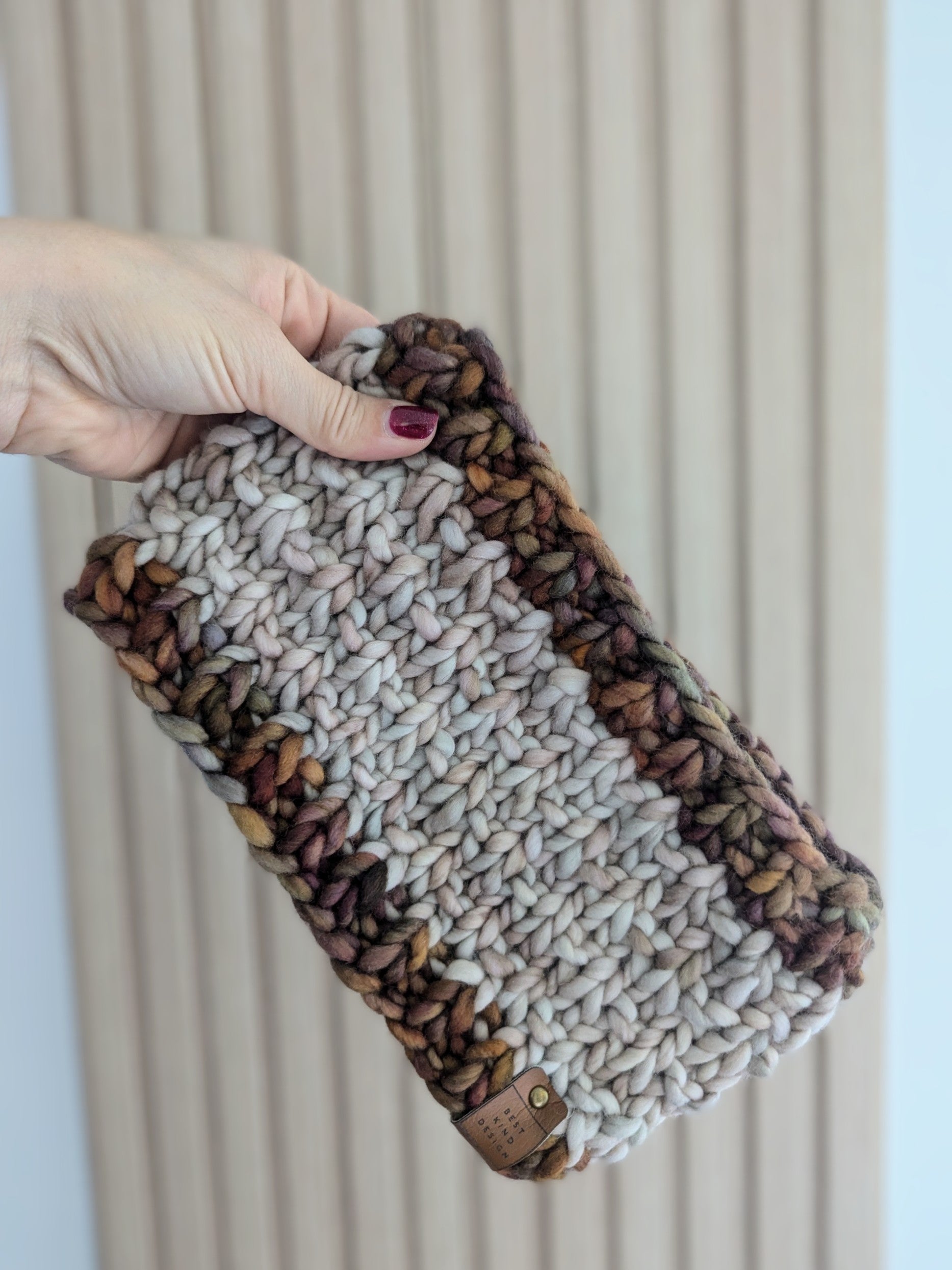 This headband is knit using a luxury hand dyed merino wool yarn. The main colour is a beautiful neutral with a variegated yarn brim. It's warm and cozy and is designed to fit a large womens head. The headband measures approximately 5" wide x 10" long.