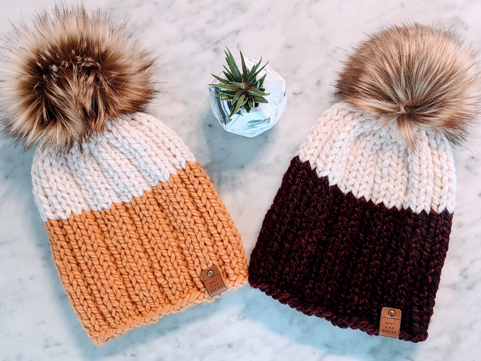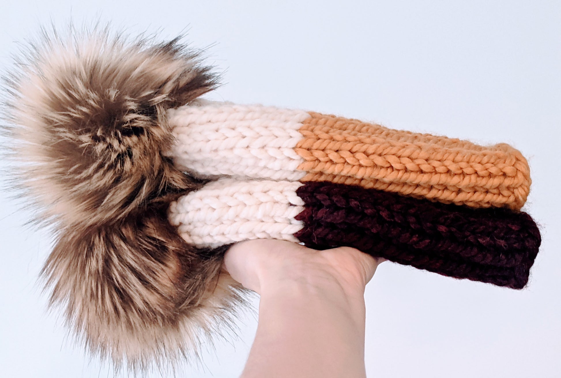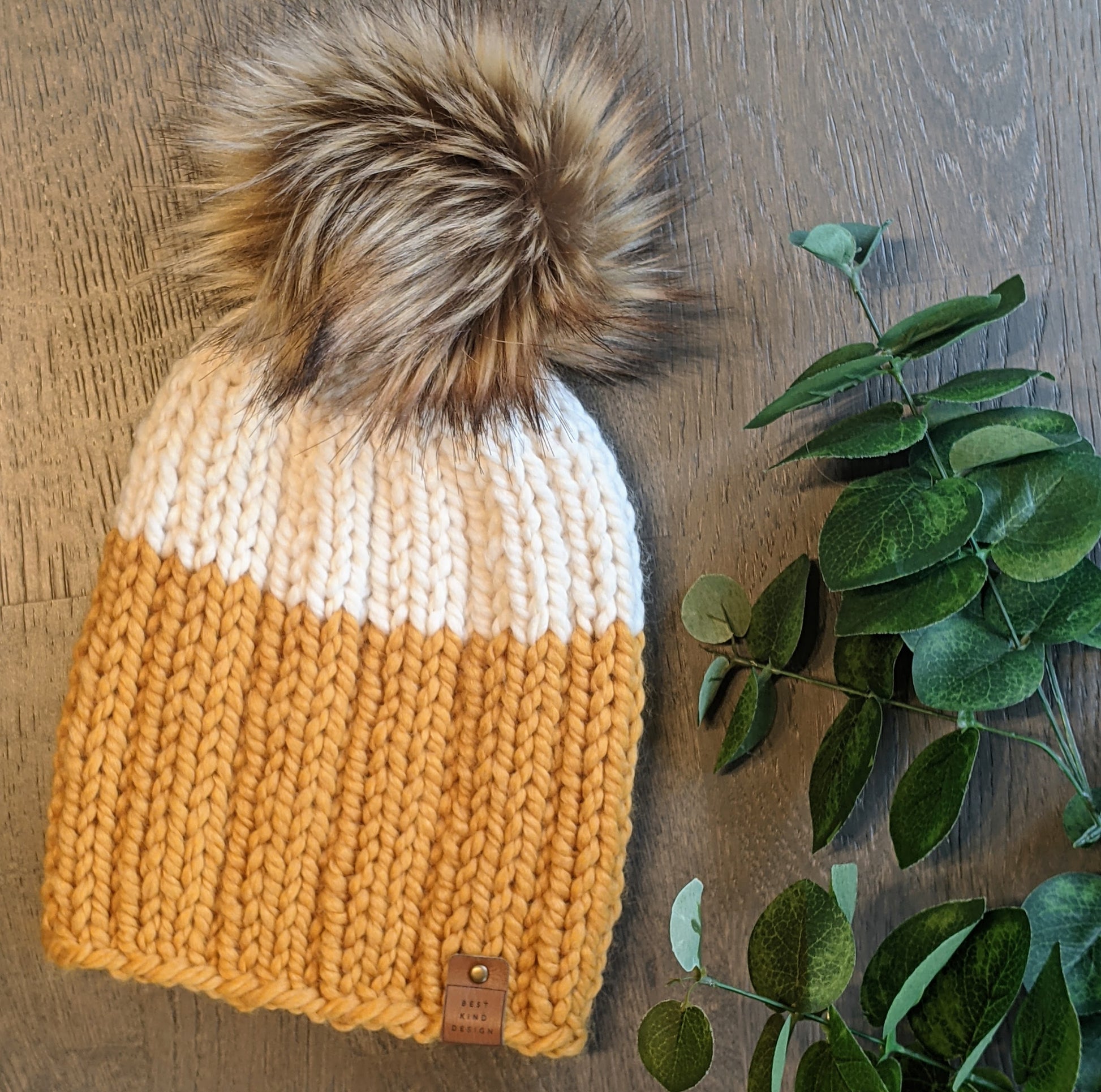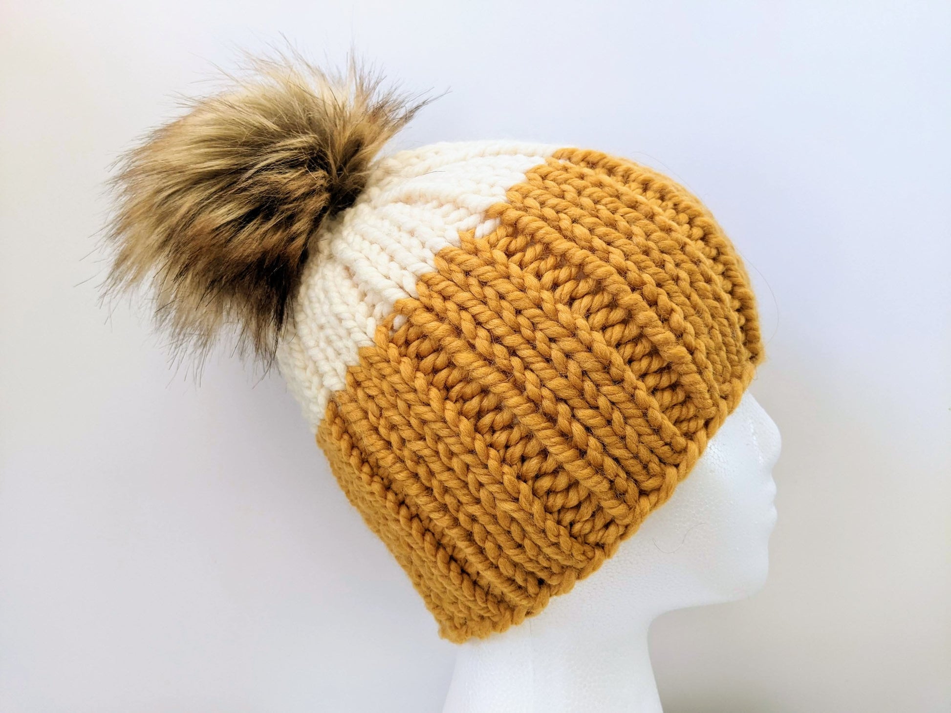 This hat features a mustard/cream combo, adorned with a handmade faux fur luxe pom pom in Fawn. This beanie will fit most 10+ year old and adult heads with a typical 21"-23" head circumference. It measures 7.5" wide x 9" high (excluding pop pom)