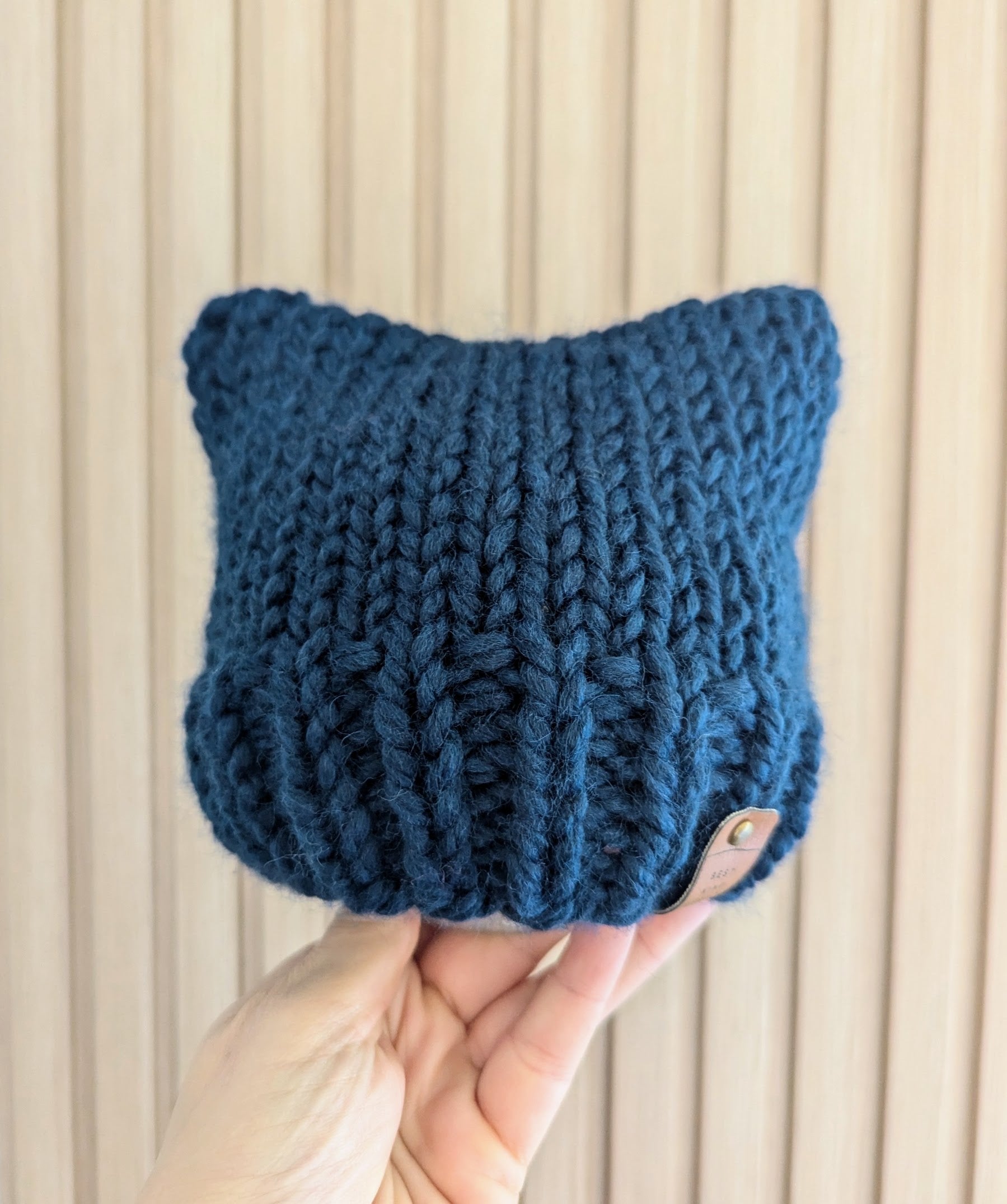 MEOW! Flaunt your feline love with this "Kitty" Ear beanie! Your little one will be stepping out in style when they wear their hand knit hat!