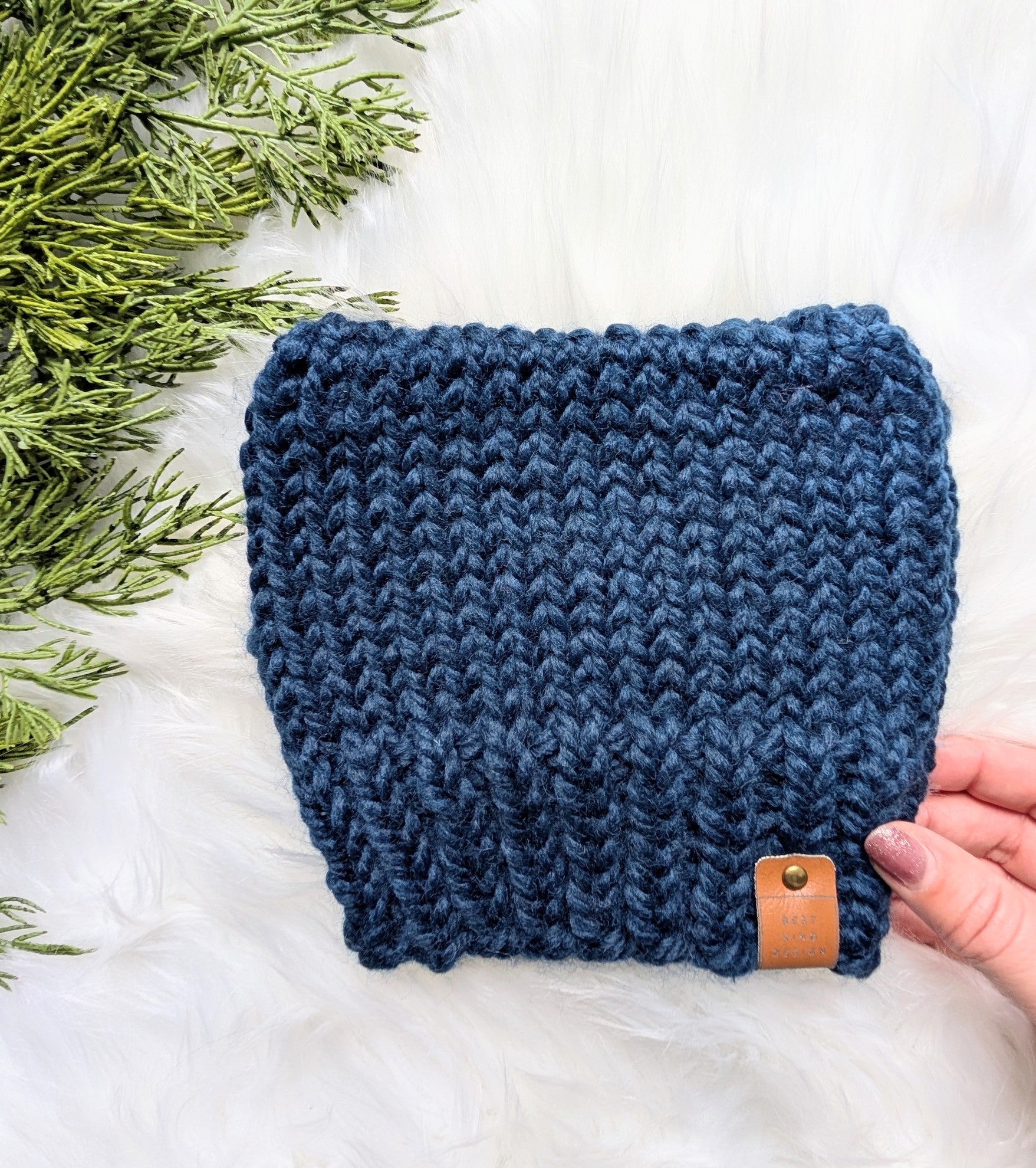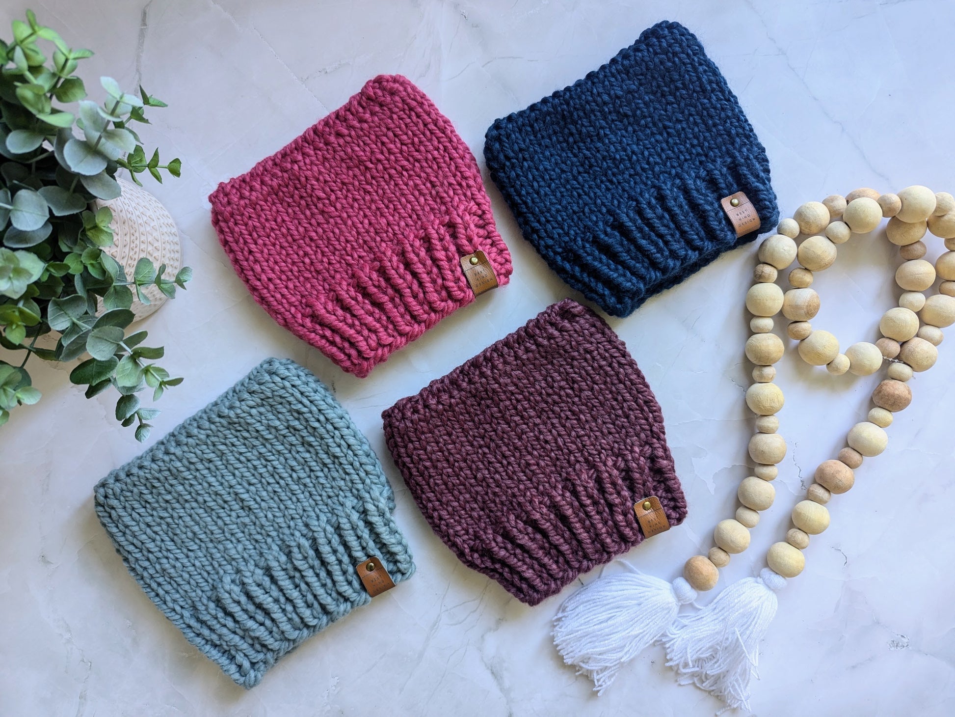 This hand knit hat comes in a variety of colours and is adorned with a faux leather detachable tag.