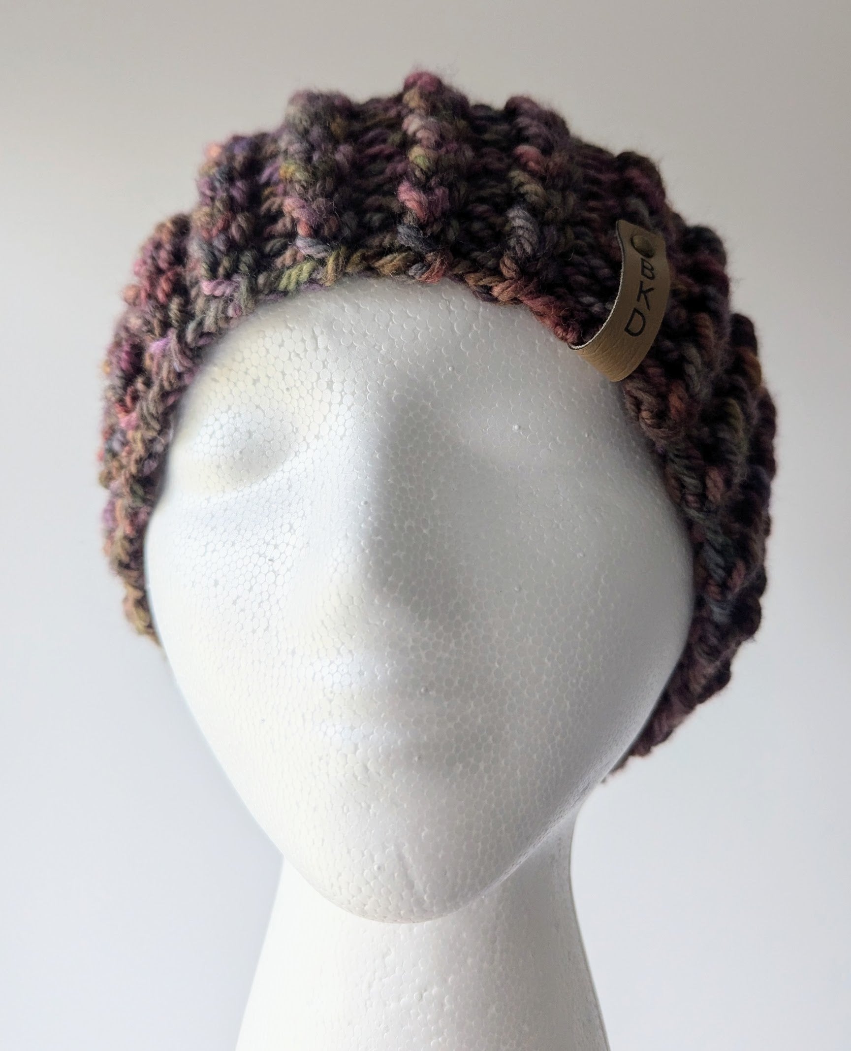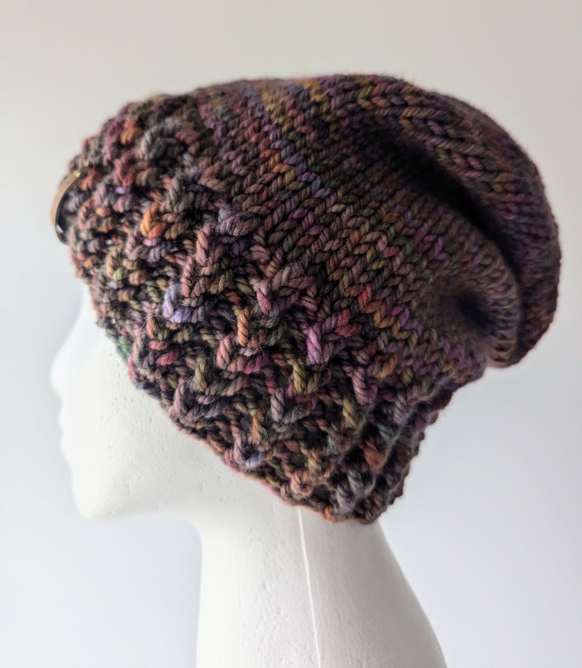 Step out in style this winter with this beautiful 'Twist' Winter Hat. This winter beanie is hand knit in a luxury wool and is designed to fit an average size adult. It is knit in a striking hand-dyed merino yarn, and features a intricate brim with a slouchy fit.