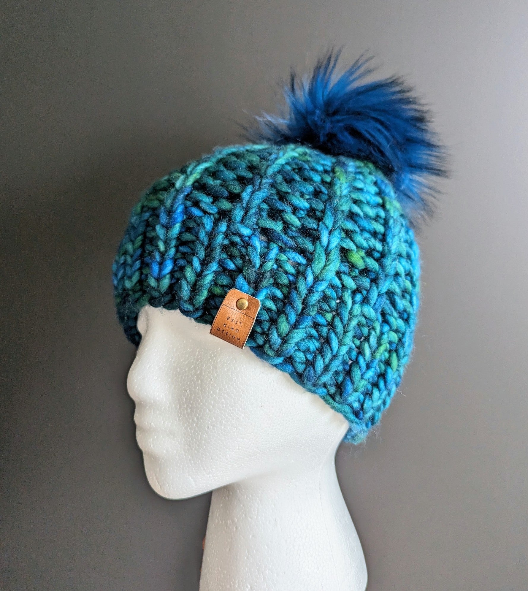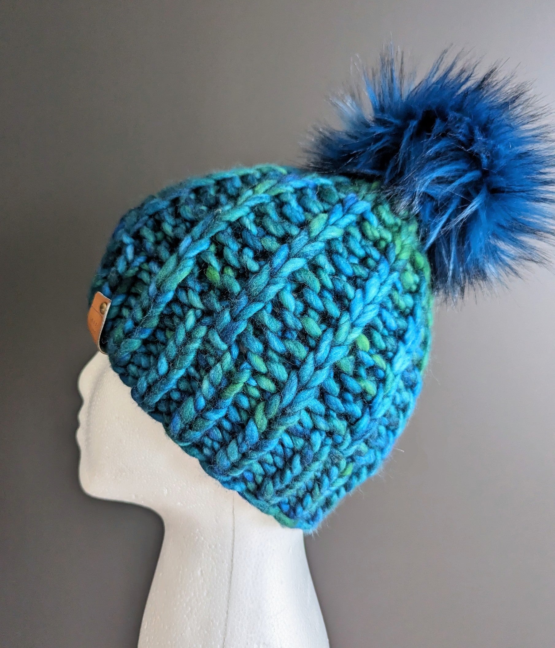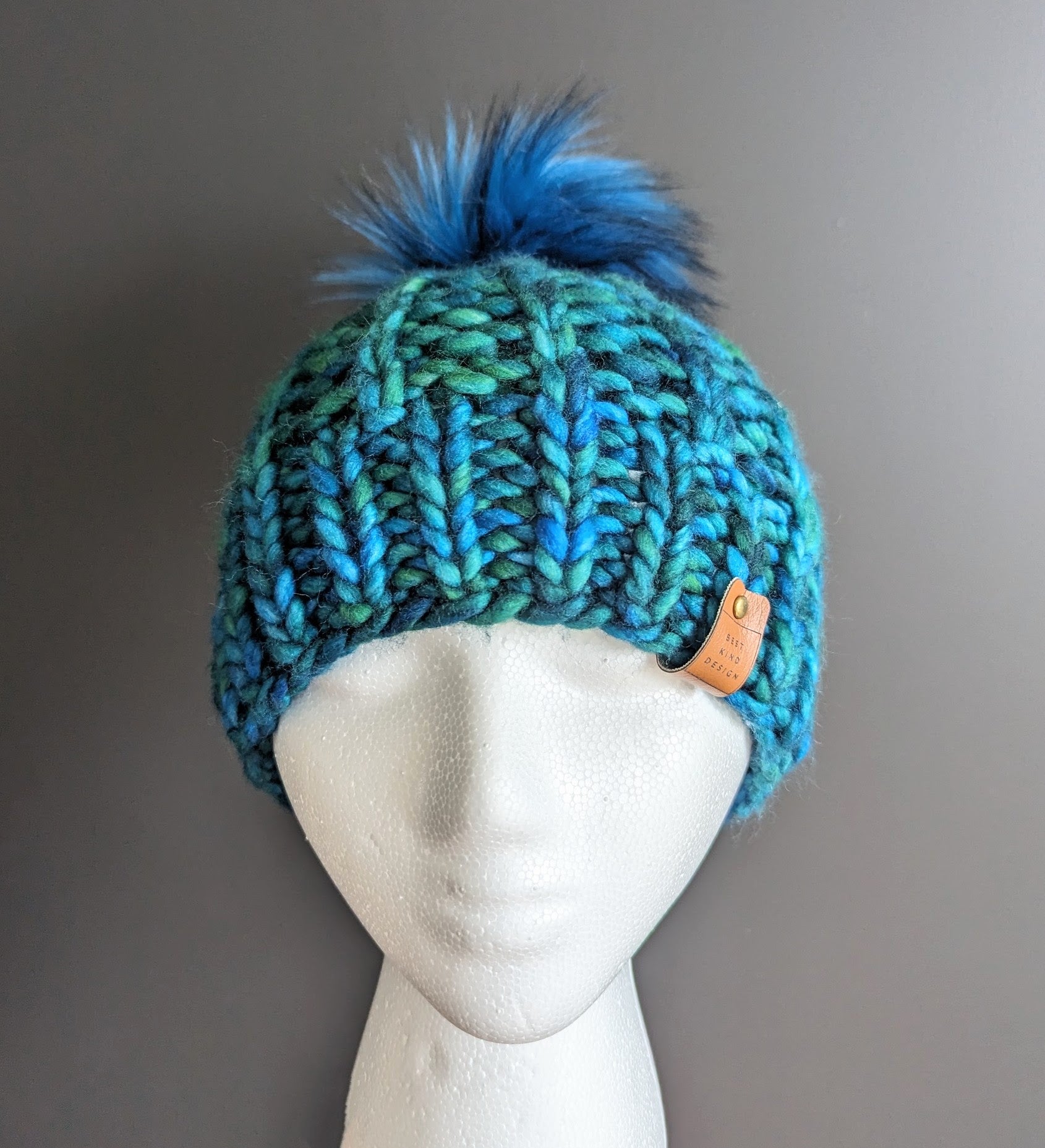 Step out in style this winter with this beautiful 'Rain Lily' Winter Hat. This beautiful winter beanie is hand knit in a luxury merino wool, and is designed to fit an average size Adult. It is knit in a striking hand-painted blue/green yarn, and is adorned with a 5" luxury Ocean faux fur pom pom.