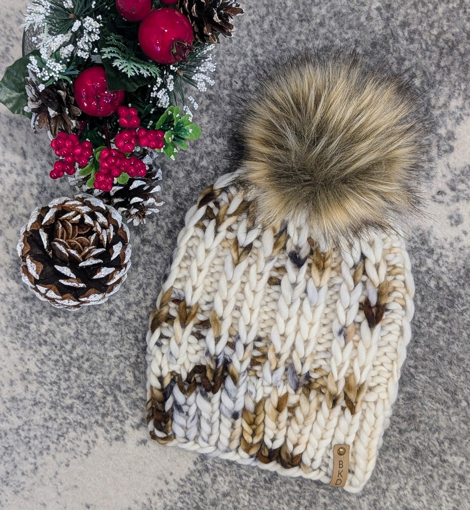 Step out in style this winter with this beautiful 'Longline" Winter Hat. This beautiful winter beanie is hand knit in a luxury hand-dyed merino wool from a Canadian dyer, and is designed to fit an average size Adult. It is adorned with a 5" luxury faux fur pom pom.