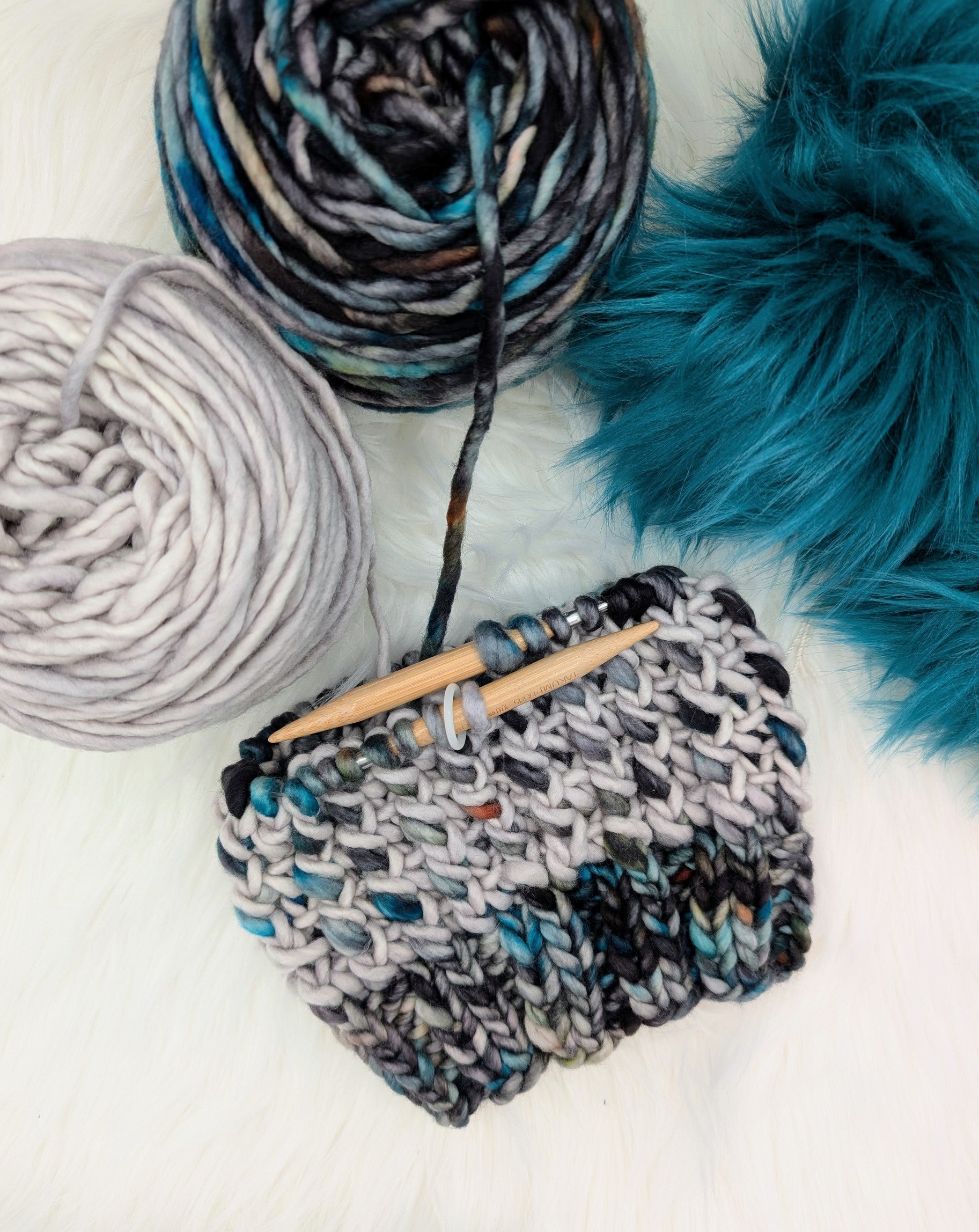 Yarn used is a merino wool. Pom pom is faux fur and is detachable.