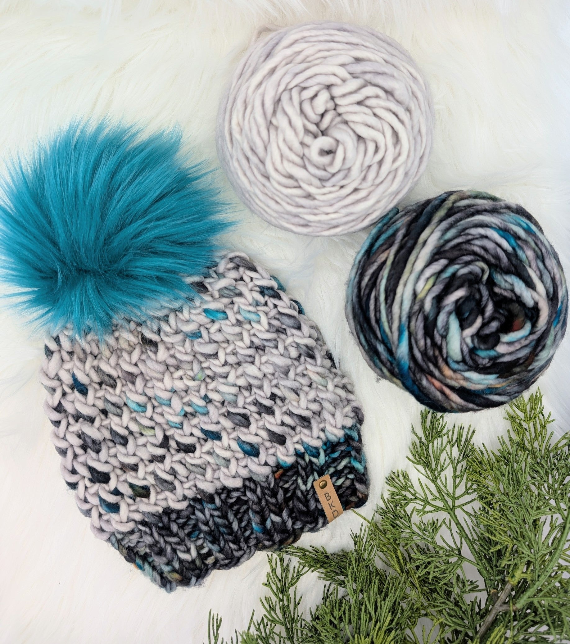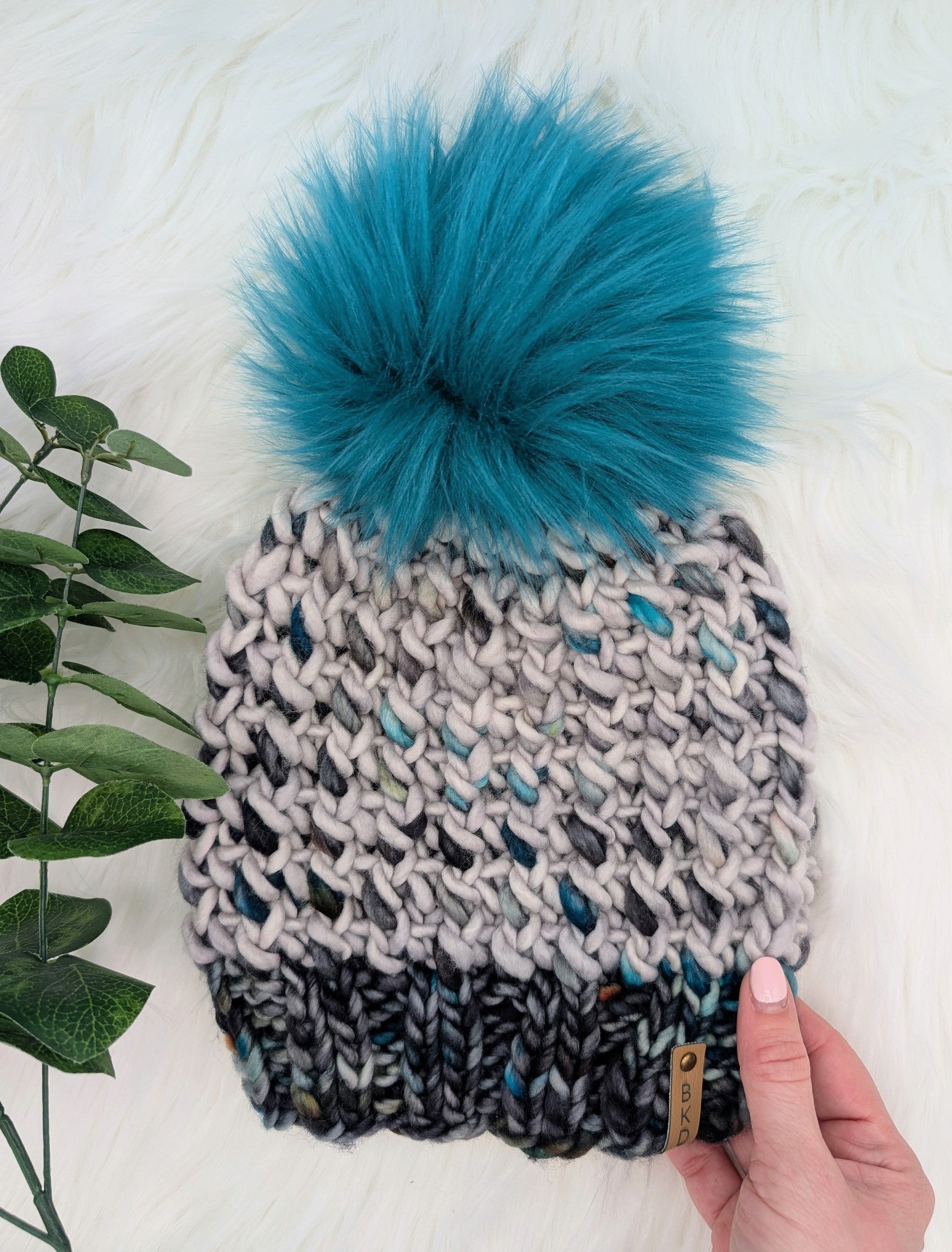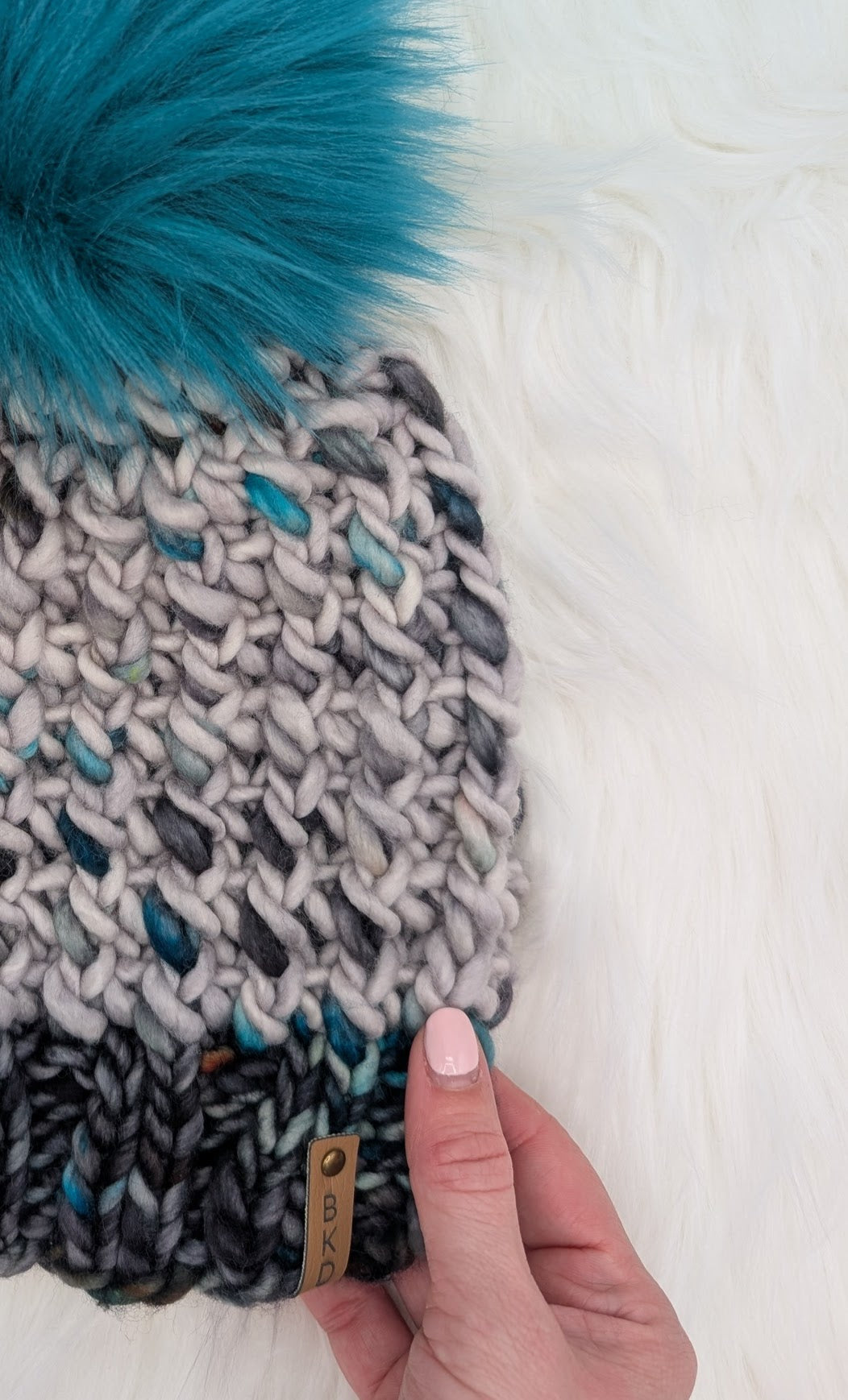 Step out in style this winter with this beautiful 'Reeses' Winter Hat. This beautiful winter beanie is hand knit in a luxury merino wool, and is designed to fit an average size Adult. It is knit in a striking variegated yarn, and is adorned with a 5" luxury faux fur pom pom.