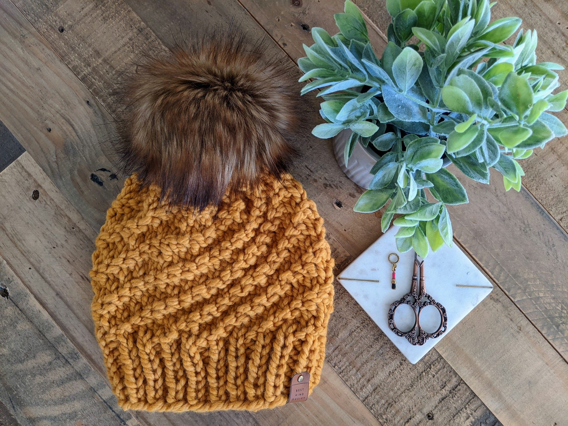 This hat comes in a beautiful neutral mustard colourway and is adorned with a handmade faux-fur luxe Fawn brown removeable pompom.