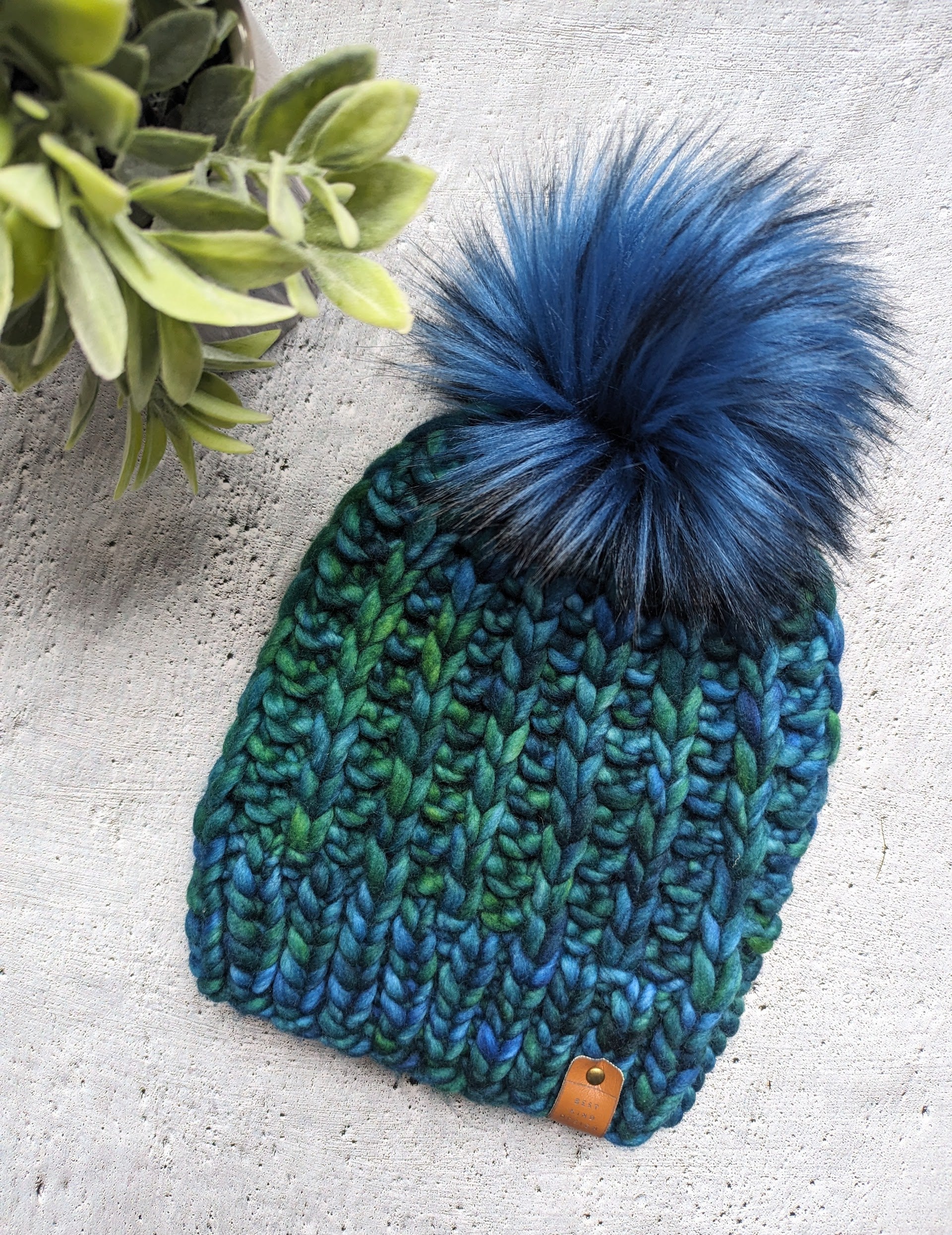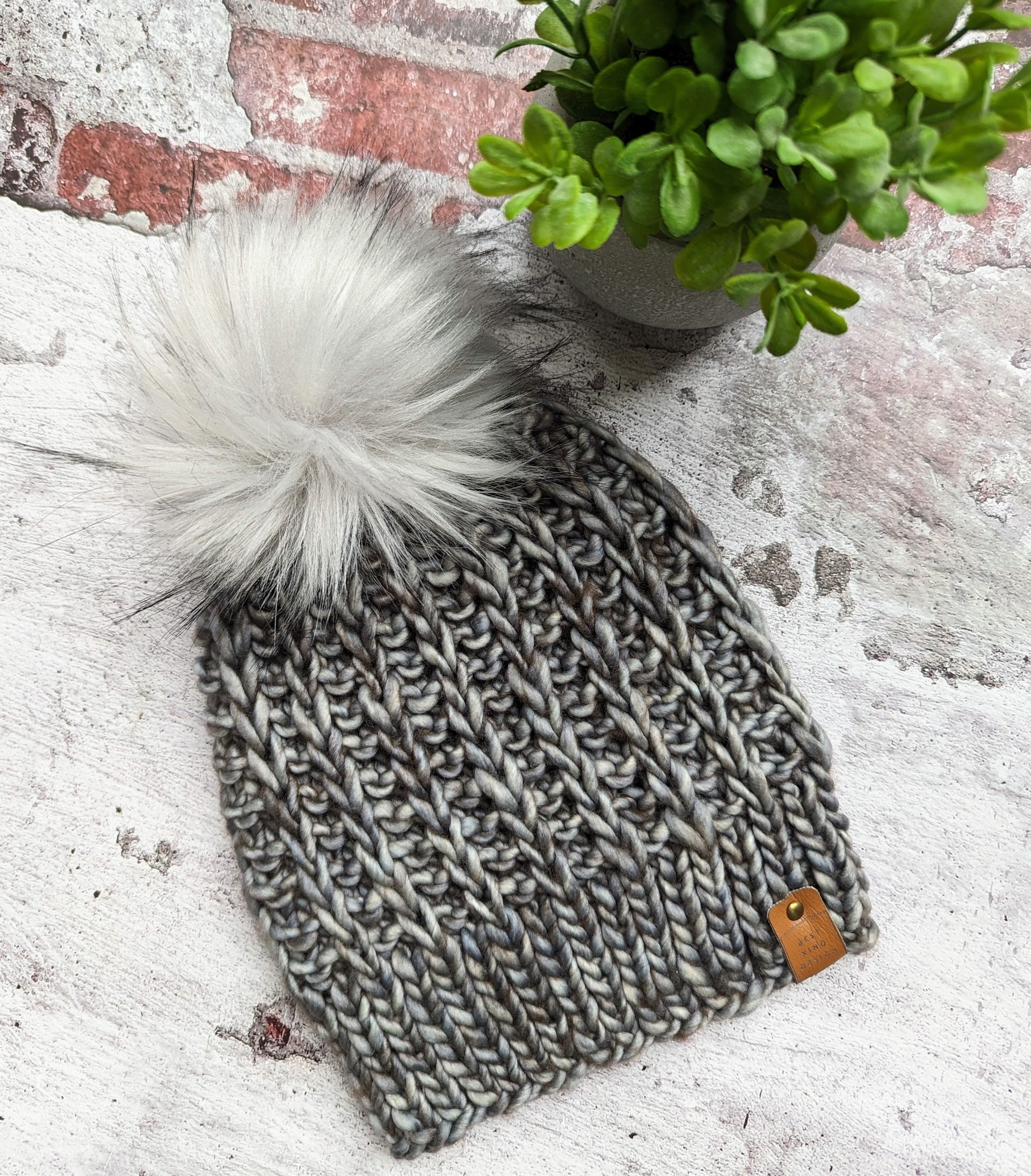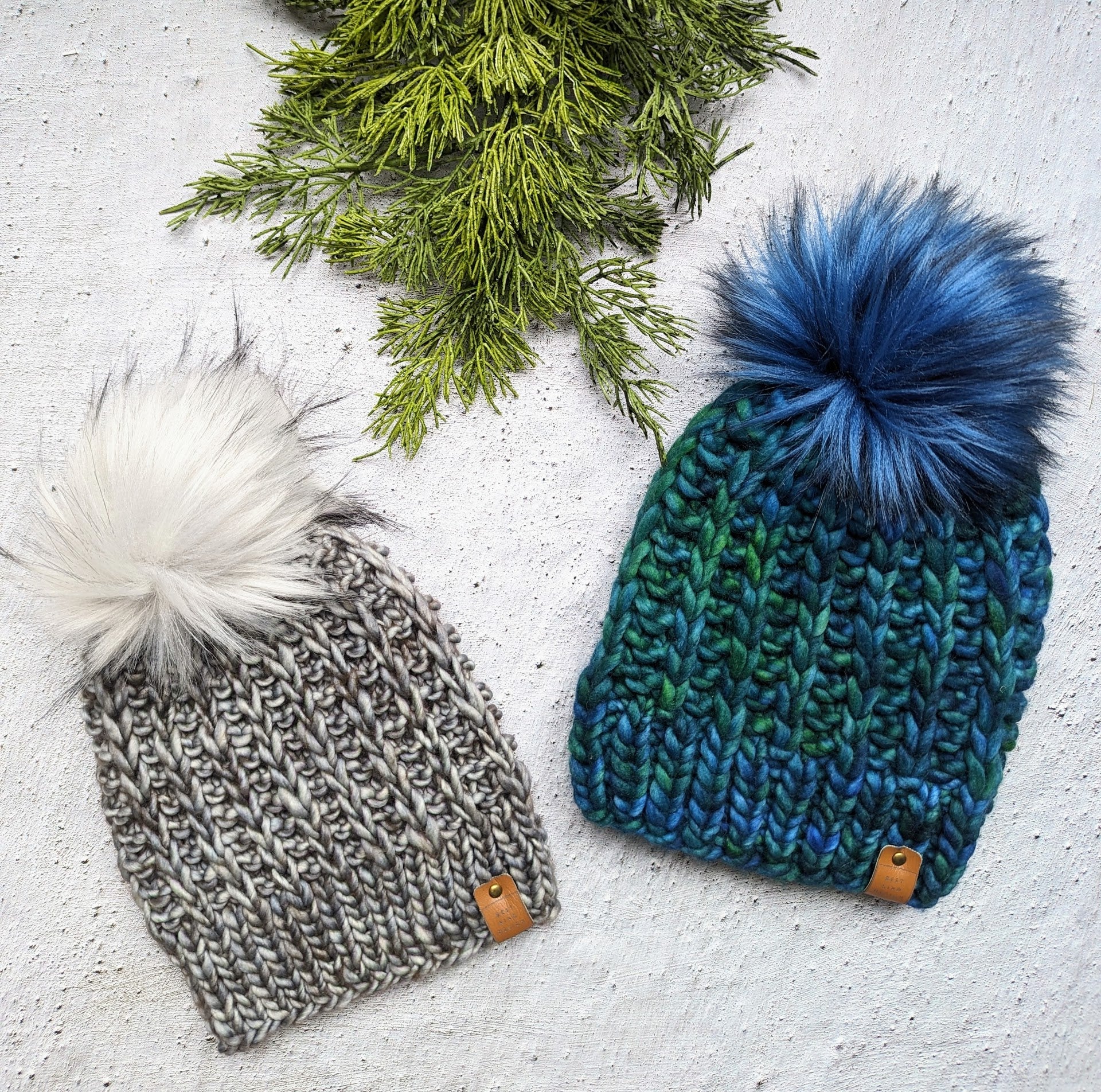 This pattern is knit in the round and uses knit, purl and slip stitches. It is a quick project that is full of texture, and is beginner friendly. Please note this pattern is for the knit hat only; there are no instructions on how to make a faux fur pom pom.