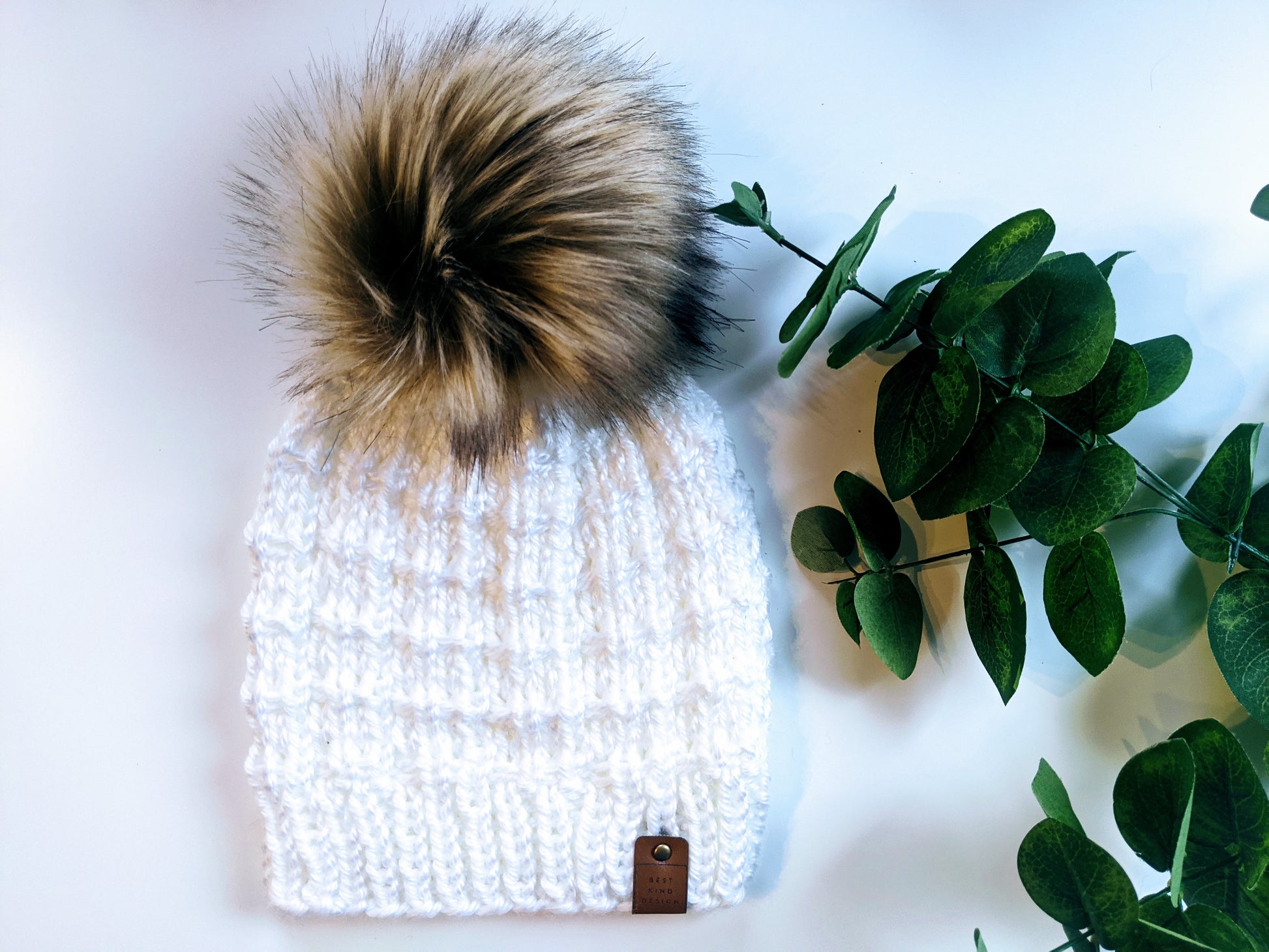 This pattern is knit in the round and uses knit, purl and slip stitches. It is a quick project that is full of texture, and is beginner friendly. Please note this pattern is for the knit hat only; there are no instructions on how to make a faux fur pom pom.