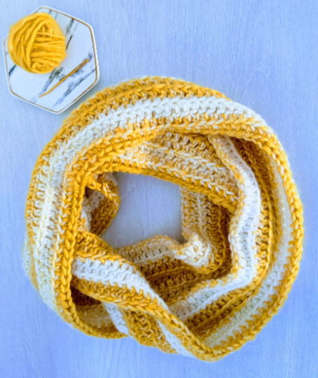 Step out in style this winter with a beautiful 'Stephanie' mustard and cream infinity scarf! This soft and textured scarf features a trendy ombre pattern, and is lightweight, lofty, and very versatile. It can be worn long, wrapped once for a draped scarf look, or wrapped three times for warm neck coverage.
